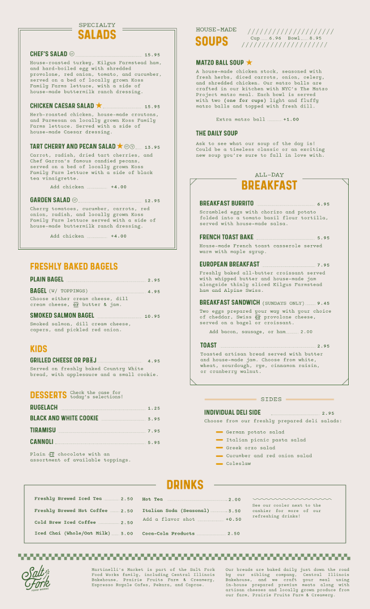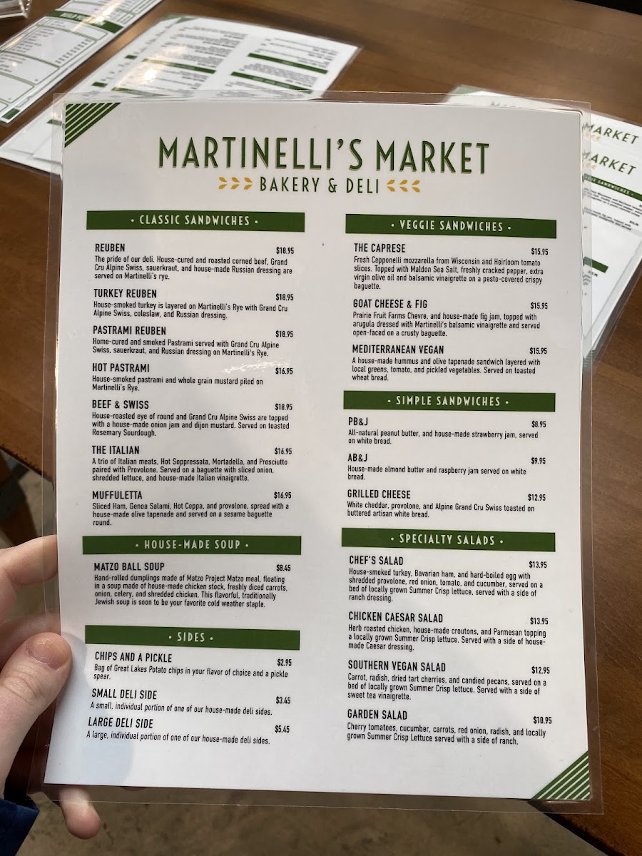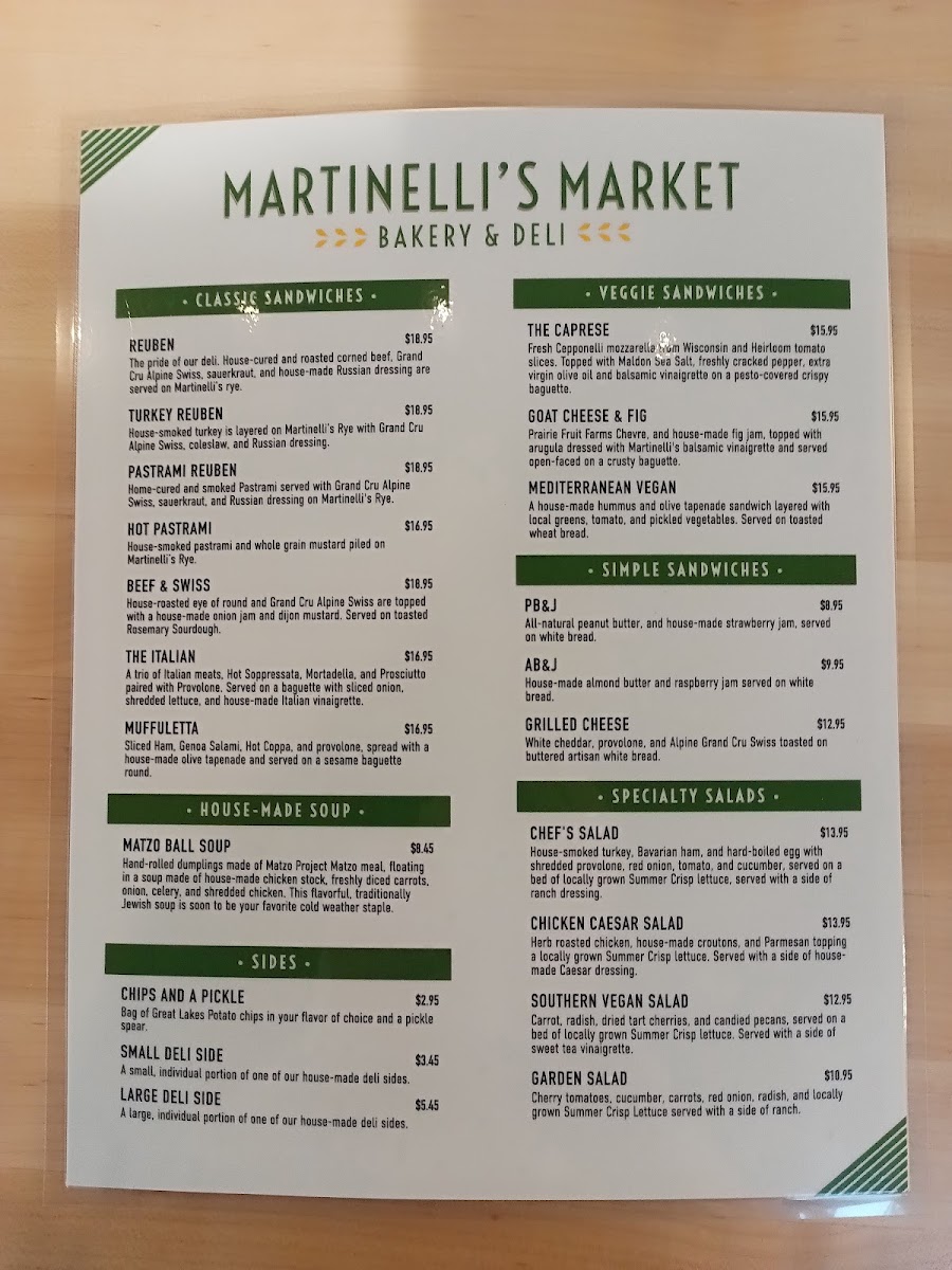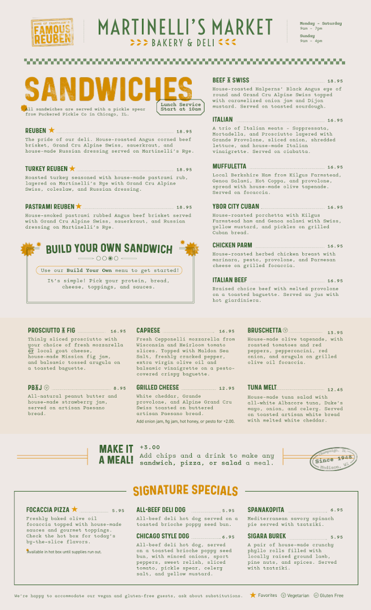 From the moment you glance at Martinelli's Market - Bakery & Deli's menu, it’s clear that the offerings are both diverse and thoughtfully curated. The sandwich section shines with classics like the REUBEN, TURKEY REUBEN , PASTRAMI REUBEN, the ITALIAN, and the zesty YBOR CITY CUBAN, each promising a hearty, flavorful experience. Their SIGNATURE SPECIALS such as the FOCACCIA PIZZA V, ALL-BEEF DELI DOG, and CHICAGO STYLE DOGS cater to comfort food enthusiasts, while Mediterranean-inspired bites like SPANAKOPITA and SIGARA BUREK add an elegant twist. For lighter fare, the SPECIALTY SALADS are enticing, featuring the protein-rich CHEF'S SALAD GF, the classic CHICKEN CAESAR SALAD , the sweet-savory TART CHERRY AND PECAN SALAD V GF, and a crisp GARDEN SALAD V GF. Soup lovers can enjoy the homey MATZO BALL SOUP or the ever-changing DAILY SOUP, while breakfast aficionados are treated to an array of ALL-DAY BREAKFAST options, including the hearty BREAKFAST BURRITO, indulgent FRENCH TOAST BAKE, traditional EUROPEAN BREAKFAST, BREAKFAST SANDWICH (SUNDAYS ONLY), and simple TOAST. Bagel enthusiasts will appreciate the PLAIN BAGEL, BAGEL (W/ TOPPINGS), or the decadent SMOKED SALMON BAGEL. Families with children can opt for the straightforward GRILLED CHEESE OR PB&J, while the dessert lineup impresses with treats like RUGELACH, BLACK AND WHITE COOKIE, TIRAMISU, and CANNOLI. To round out the meal, the SIDES include INDIVIDUAL DELI SIDE, and a well-curated drink selection features Freshly Brewed Iced Tea, Freshly Brewed Hot Coffee, Cold Brew Iced Coffee, Iced Chai (Whole/Oat Milk), and Hot Tea. Overall, the menu at Martinelli’s offers a satisfying balance of classic deli comfort, international flavors, and sweet indulgences, making it a versatile spot for any time of day.