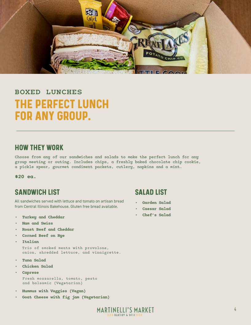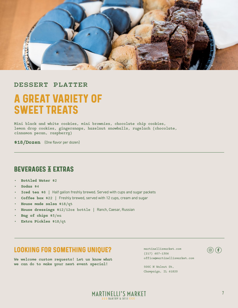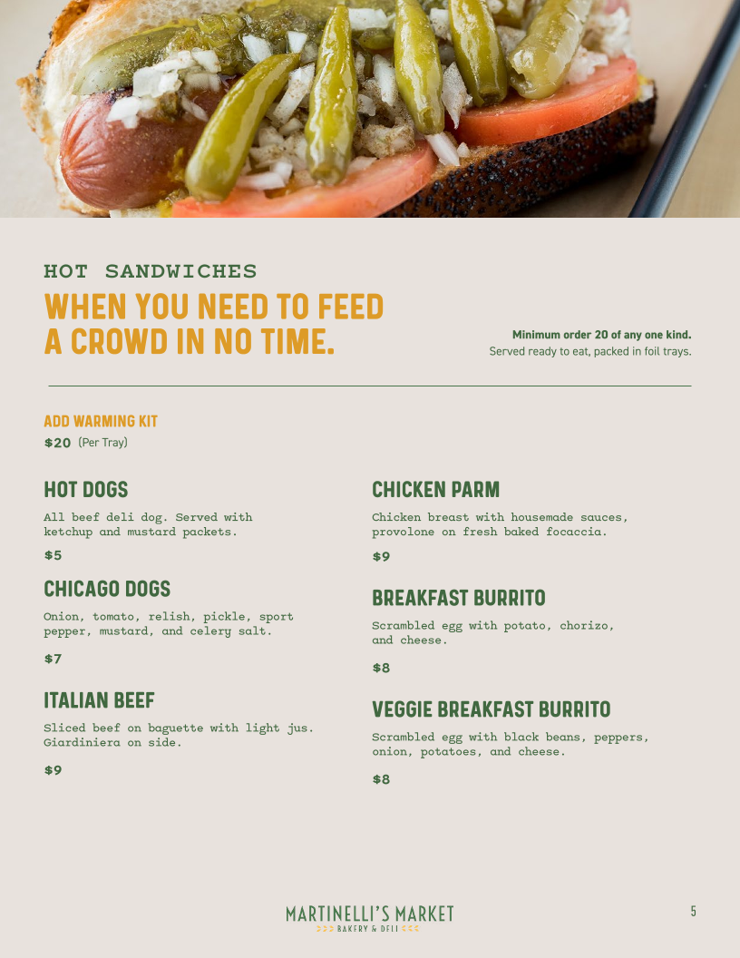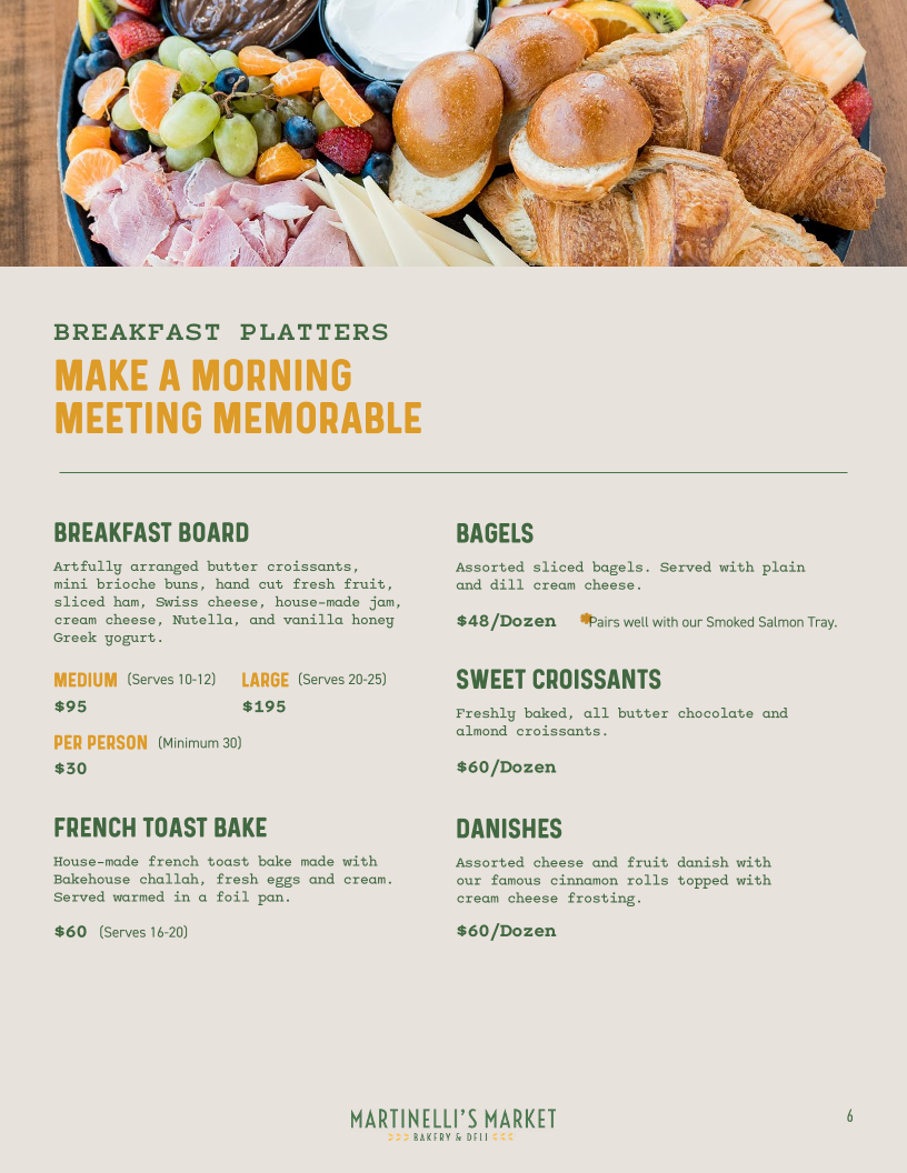 From the moment you glance at Martinelli's Market - Bakery & Deli's menu, it’s clear that the offerings are both diverse and thoughtfully curated. The sandwich section shines with classics like the REUBEN, TURKEY REUBEN , PASTRAMI REUBEN, the ITALIAN, and the zesty YBOR CITY CUBAN, each promising a hearty, flavorful experience. Their SIGNATURE SPECIALS such as the FOCACCIA PIZZA V, ALL-BEEF DELI DOG, and CHICAGO STYLE DOGS cater to comfort food enthusiasts, while Mediterranean-inspired bites like SPANAKOPITA and SIGARA BUREK add an elegant twist. For lighter fare, the SPECIALTY SALADS are enticing, featuring the protein-rich CHEF'S SALAD GF, the classic CHICKEN CAESAR SALAD , the sweet-savory TART CHERRY AND PECAN SALAD V GF, and a crisp GARDEN SALAD V GF. Soup lovers can enjoy the homey MATZO BALL SOUP or the ever-changing DAILY SOUP, while breakfast aficionados are treated to an array of ALL-DAY BREAKFAST options, including the hearty BREAKFAST BURRITO, indulgent FRENCH TOAST BAKE, traditional EUROPEAN BREAKFAST, BREAKFAST SANDWICH (SUNDAYS ONLY), and simple TOAST. Bagel enthusiasts will appreciate the PLAIN BAGEL, BAGEL (W/ TOPPINGS), or the decadent SMOKED SALMON BAGEL. Families with children can opt for the straightforward GRILLED CHEESE OR PB&J, while the dessert lineup impresses with treats like RUGELACH, BLACK AND WHITE COOKIE, TIRAMISU, and CANNOLI. To round out the meal, the SIDES include INDIVIDUAL DELI SIDE, and a well-curated drink selection features Freshly Brewed Iced Tea, Freshly Brewed Hot Coffee, Cold Brew Iced Coffee, Iced Chai (Whole/Oat Milk), and Hot Tea. Overall, the menu at Martinelli’s offers a satisfying balance of classic deli comfort, international flavors, and sweet indulgences, making it a versatile spot for any time of day.