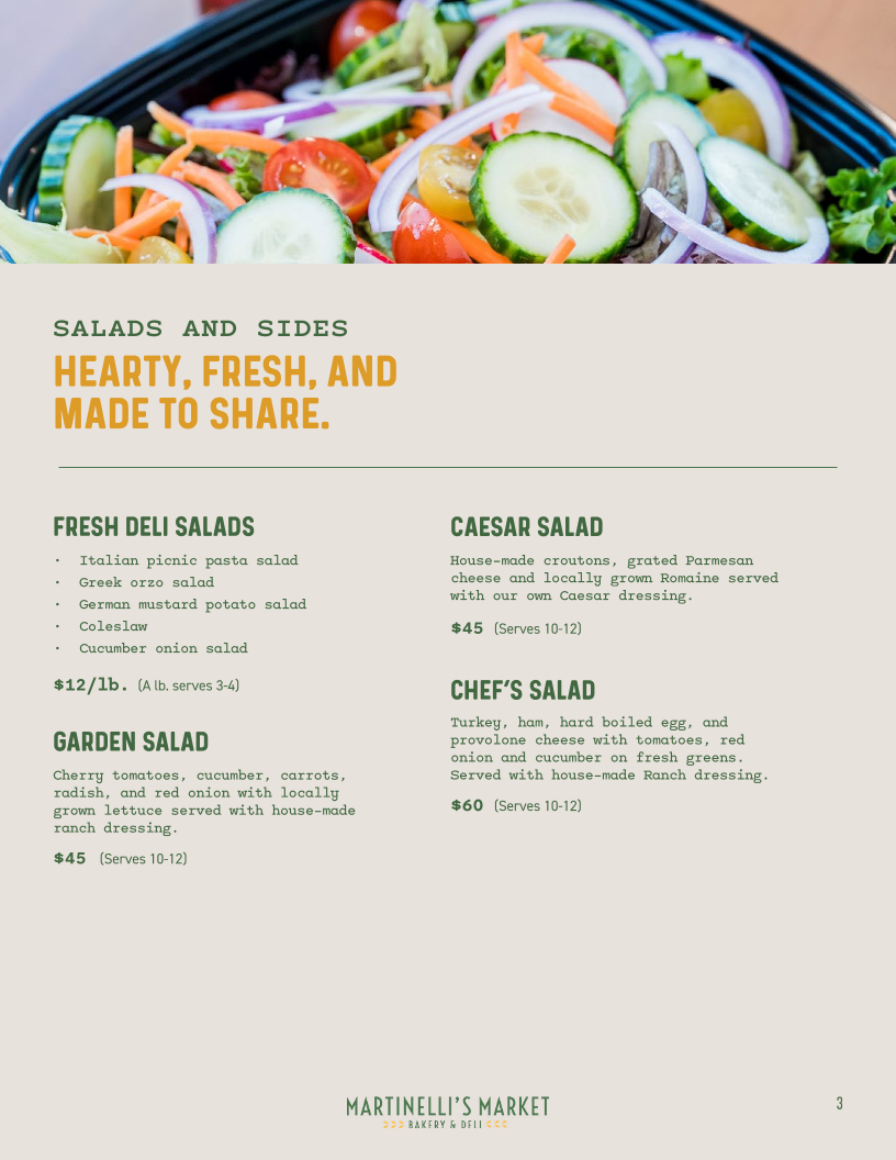 Choose from our freshly prepared deli salads: German potato salad, Italian picnic pasta salad, Greek orzo salad, Cucumber and red onion salad, Coleslaw.